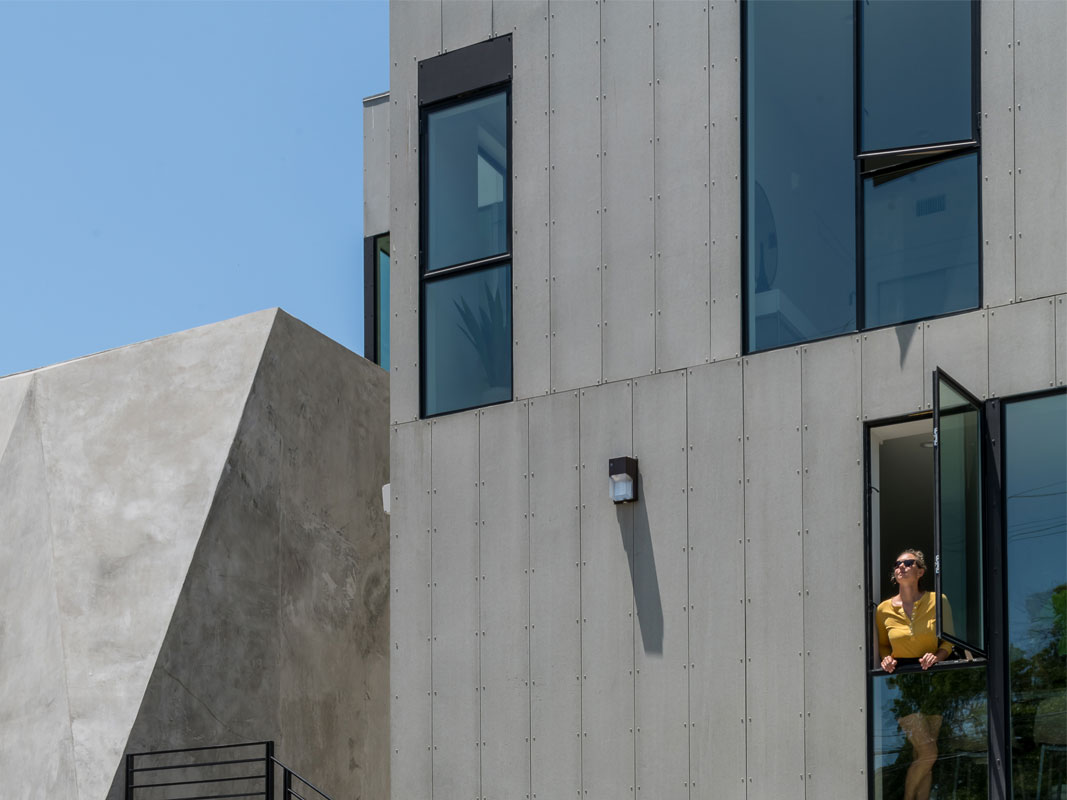 The homes are clad with white cement board siding on the outward faces of the building, the materiality subtly shifting to white stucco within a series of internal circulation paths that are open to the sky above. These paths are again intended to express verticality, the corridors like slots in a canyon, creating a unique spatial experience. Drought tolerant landscaping is used throughout the site, as well as a rainwater capture-and-reuse system for irrigation. Designed as an alternative to suburban living, residents can live in the urban center of Los Angeles and enjoy space, light, and indoor-outdoor living within a multi-family experience.