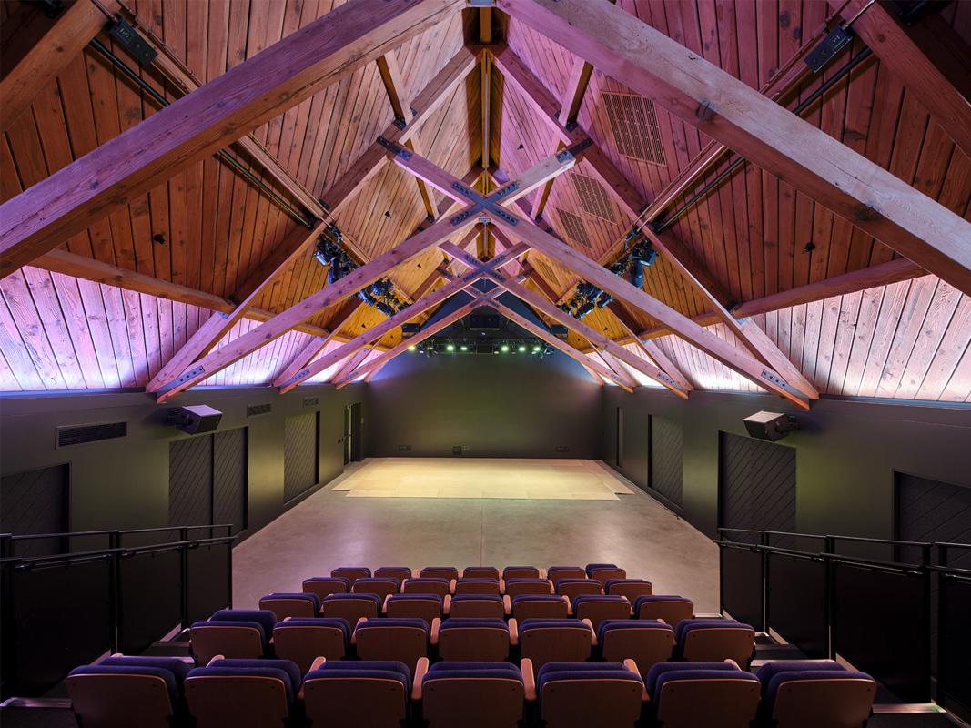 A study in past and present, transparency and opaqueness, AUX Architecture’s three-story design wraps concrete terraces around a historic A-frame that once was an MGM Studio prop house used for Gone With the Wind. In keeping with our mission to reduce carbon, we preserved the existing structure’s heavy Douglas fir beams and transformed the building into a live performance venue.